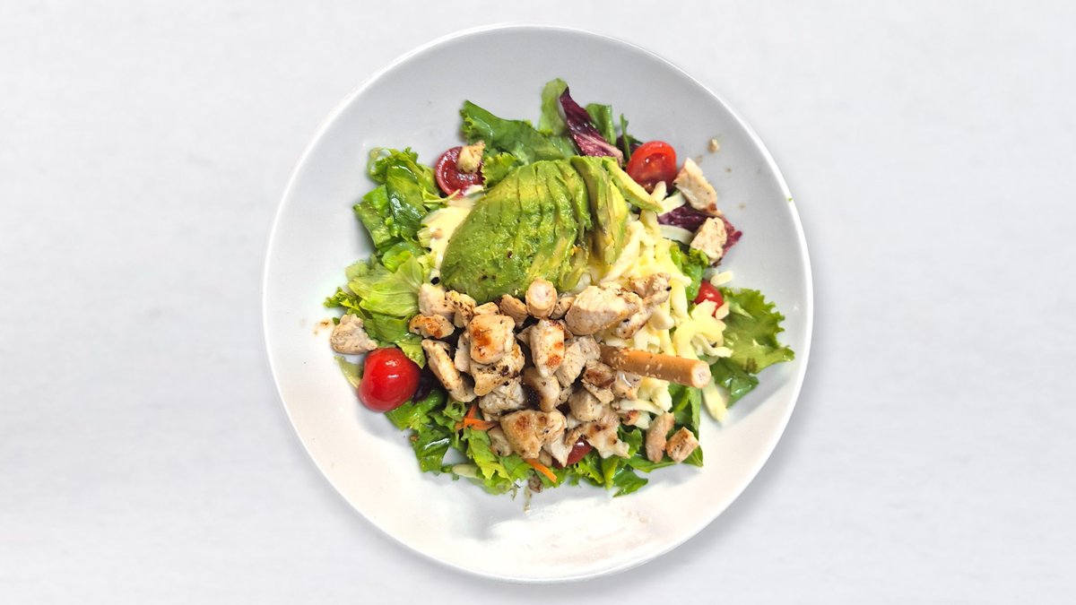 Zelena solata, radič, rukola, mlada špinača, česnjev paradižnik, avokado, korenje, mozzarela, piščanec na žaru, česnov preliv, grisin V ceno jedi je všteto doplačilo 0.50 eur za biorazgradljivo embalažo