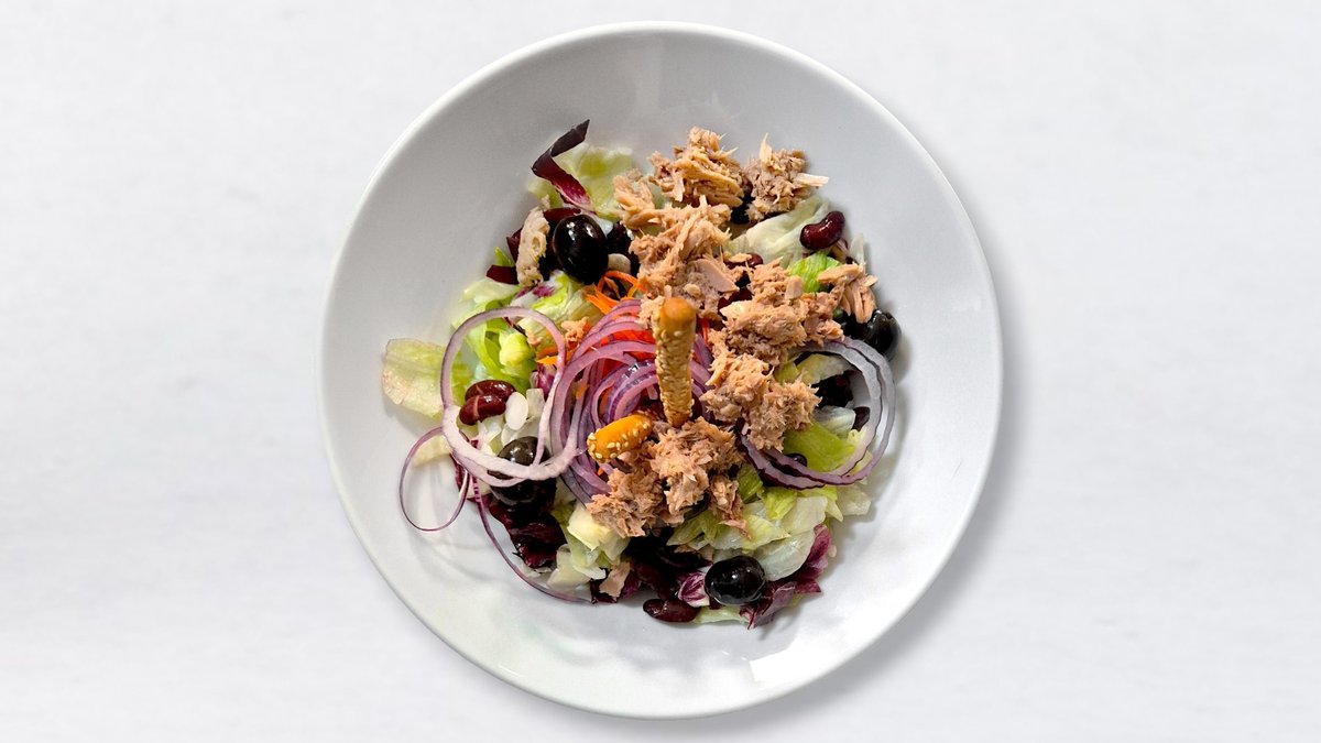 Zelena solata, radič, rdeč fižol, korenje, rdeča čebula, olive, tuna, grisin V ceno jedi je všteto doplačilo 0.50 eur za biorazgradljivo embalažo