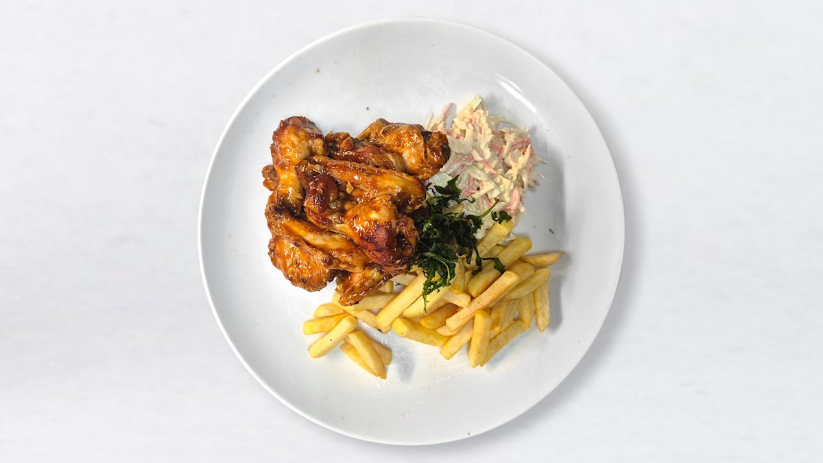 Perutničke v BBQ omaki, pomfri, ameriška solata
