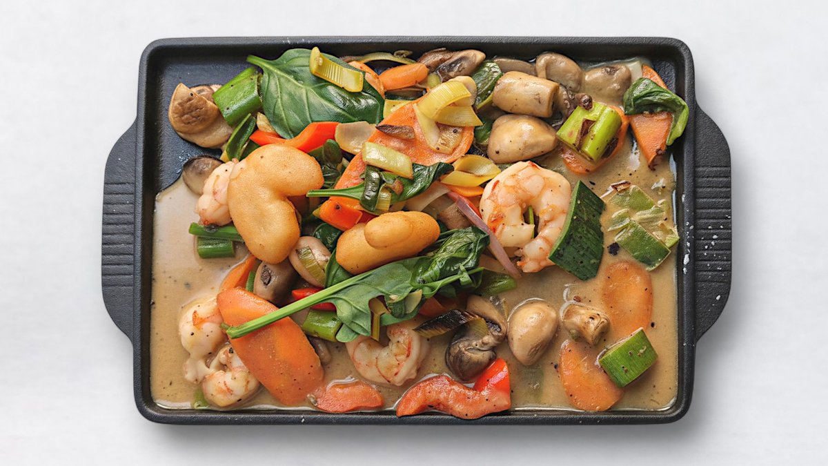 Rakci s korenjem, papriko, poprom in šampinjoni, gratiniran krompir