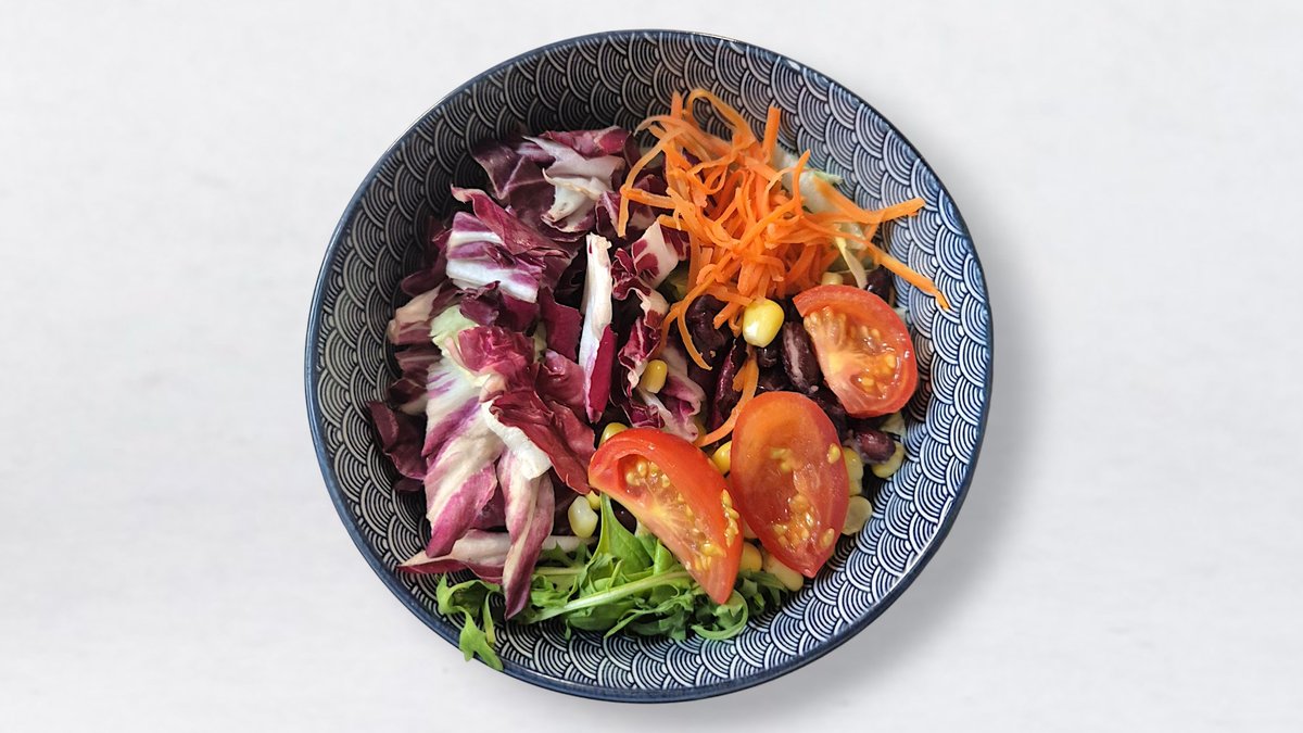 Zelena solata, radič, rukola, mlada špinača, rdeč fizol, koruza V ceno jedi je všteto doplačilo 0.50 eur za biorazgradljivo embalažo