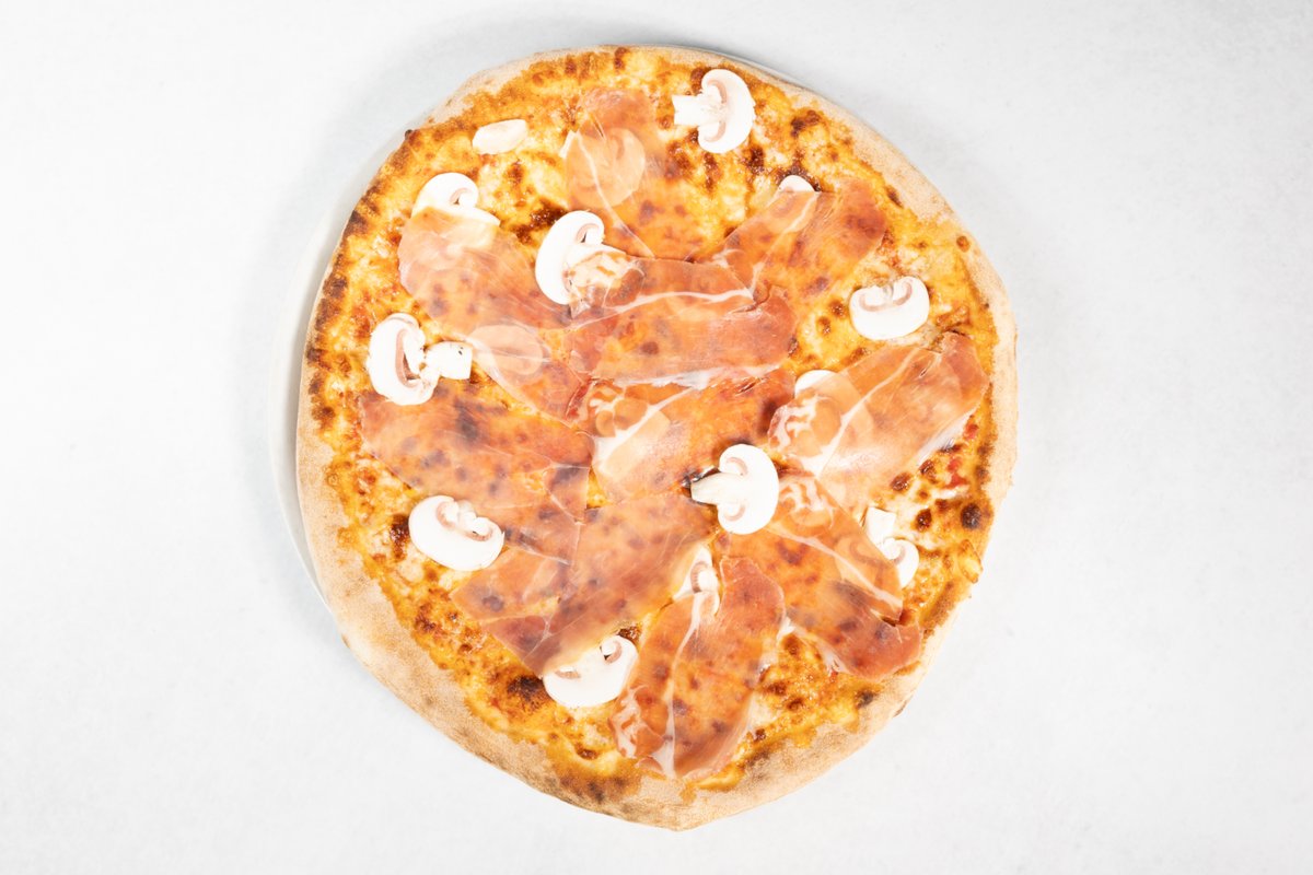 Paradižnikova omaka, sir, gobe, pršut, oliva, origano V ceno jedi je všteto doplačilo 2 eur za biorazgradljivo embalažo