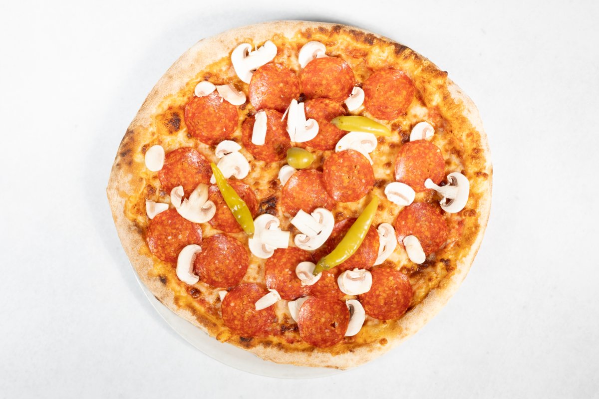 Paradižnikova omaka, sir, gobe, salama, pekoči feferoni, oliva, origano V ceno jedi je všteto doplačilo 2 eur za biorazgradljivo embalažo