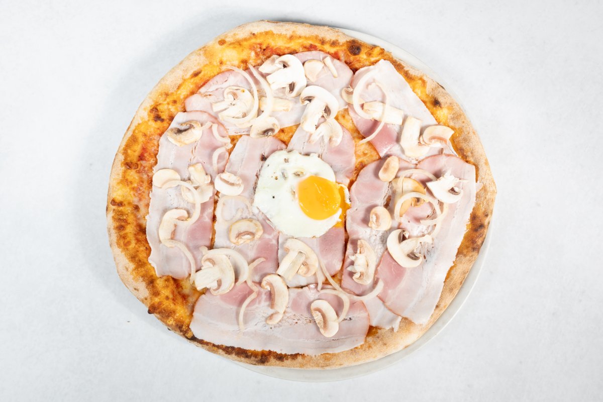 Paradižnikova omaka, sir, čebula, slanina, gobe, jajce, oliva, origano V ceno jedi je všteto doplačilo 2 eur za biorazgradljivo embalažo