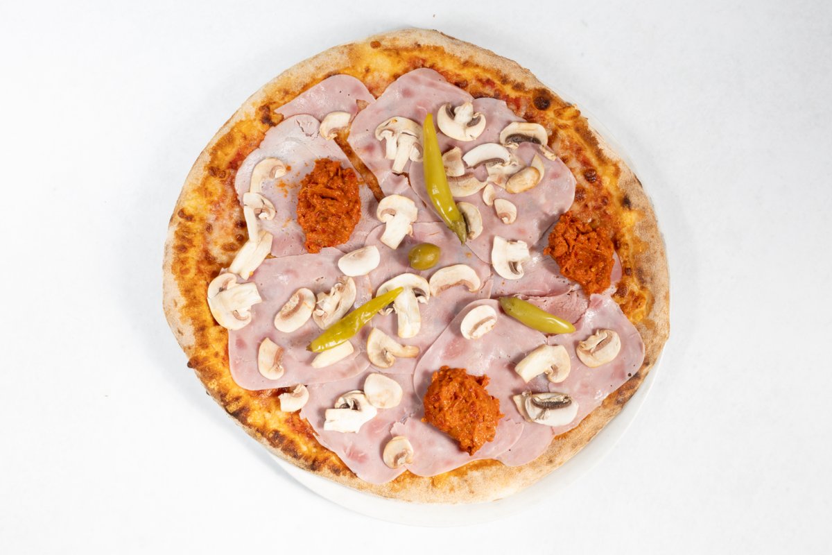 Paradižnikova omaka, sir, šunka, slanina, šink, gobe, feferon, oliva V ceno jedi je všteto doplačilo 2 eur za biorazgradljivo embalažo