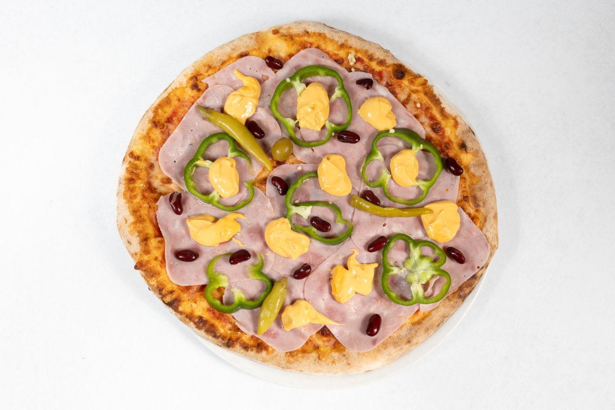 Paradižnikova omaka, sir, šunka, fižol, paprika, feferoni, nacho sir, oliva V ceno jedi je všteto doplačilo 2 eur za biorazgradljivo embalažo