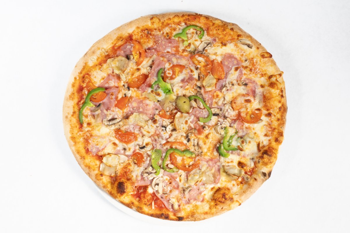 Paradižnikova omaka, sir, šunka, gobe, artičoke, paprika, oliva, origano V ceno jedi je všteto doplačilo 2 eur za biorazgradljivo embalažo