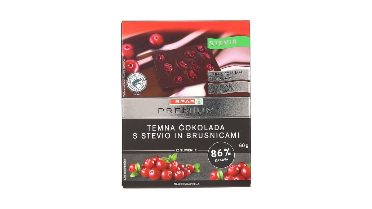 Temna čokolada s stevio in brusnicami, Spar Premium (60 g)