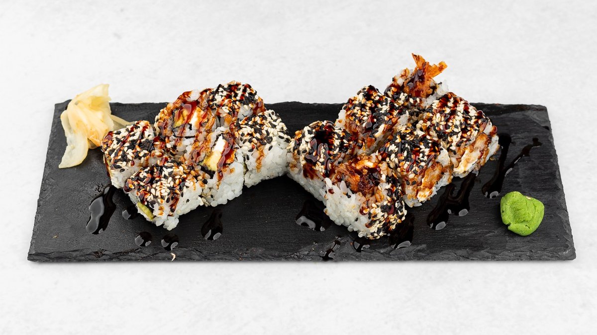 6x tempura uramaki, 2x sake nigiri, 1x unagi nigiri Jed vključuje sojino omako in palčke