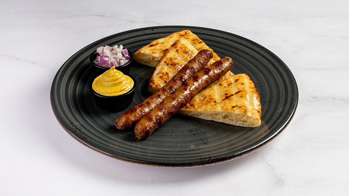 Tradicionalni čevapčiči iz čistega junčjega mesa 125 g, omaka iz kajmaka, sladka mleta paprika, lepinja, čebula V ceno jedi je vštet znesek 0.40 eur za biorazgradljivo embalažo