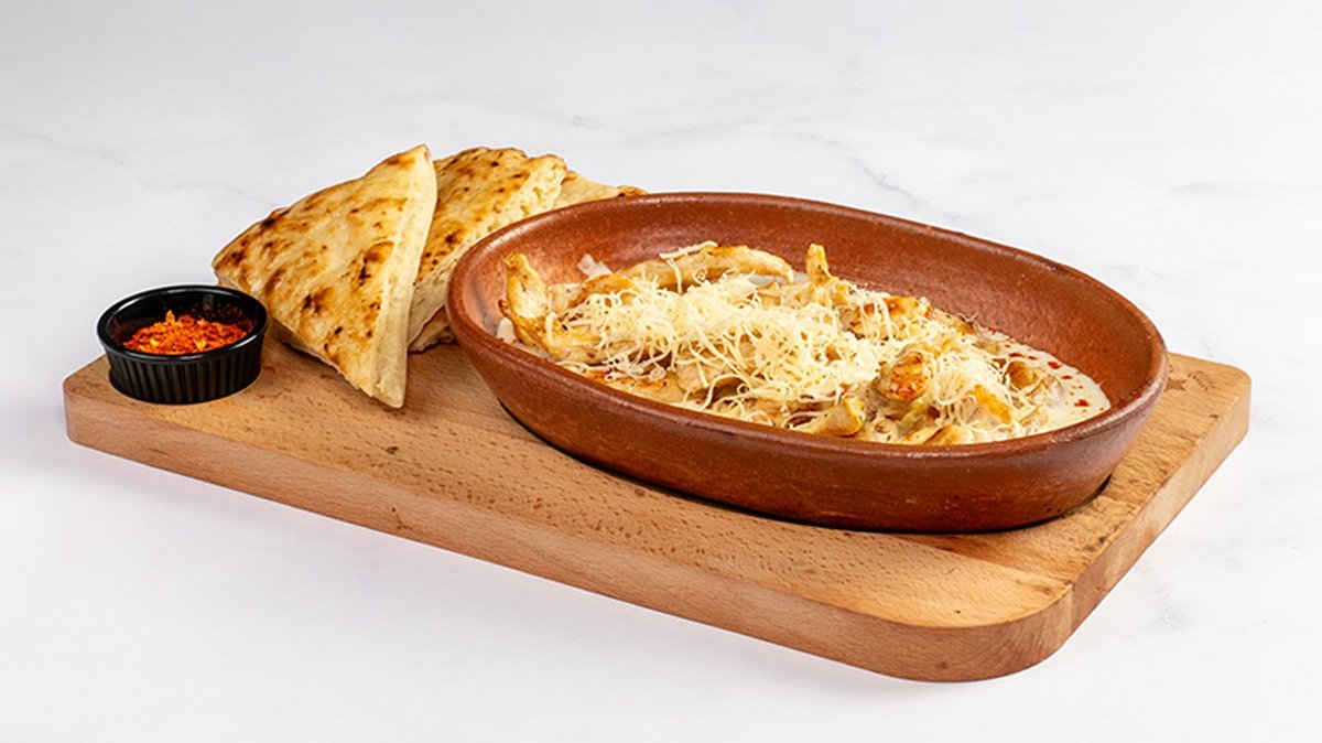 Marinirano piščančje meso 250 g, ribani sir, omaka iz kajmaka, lepinja, drobljena paprika V ceno jedi je vštet znesek 0.40 eur za biorazgradljivo embalažo