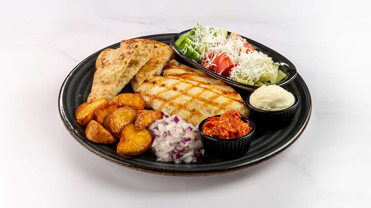 Piščančji file, šopska solata, pečeni krompirjevi krhlji 100 g, čebula, kajmak, ajvar, lepinja V ceno jedi je vštet znesek 0.40 eur za biorazgradljivo embalažo