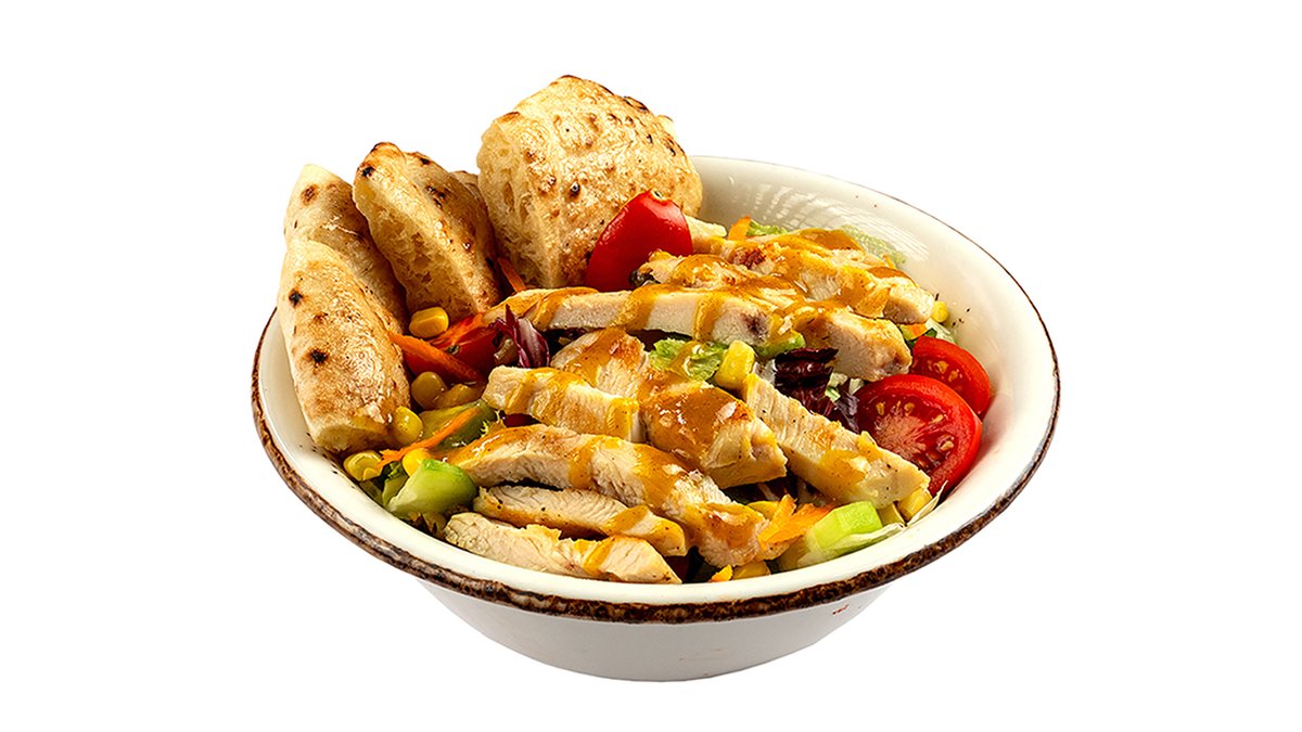 Mešanica solat 100 g, korenček, koruza, češnjev paradižnik, kumara, piščančji file 125 g, gorčično-medena omaka, lepinja V ceno jedi je vštet znesek 0.40 eur za biorazgradljivo embalažo