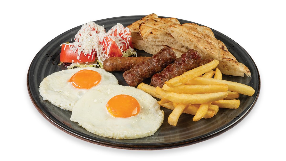 2 pečeni jajci, čevapčiči 50 g, sudžuka 60 g, paradižnik s feta sirom, pomfrit 100 g, lepinja V ceno jedi je vštet znesek 0.40 eur za biorazgradljivo embalažo