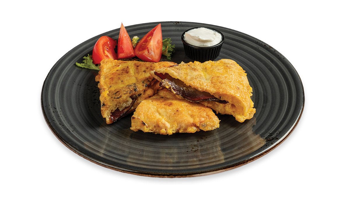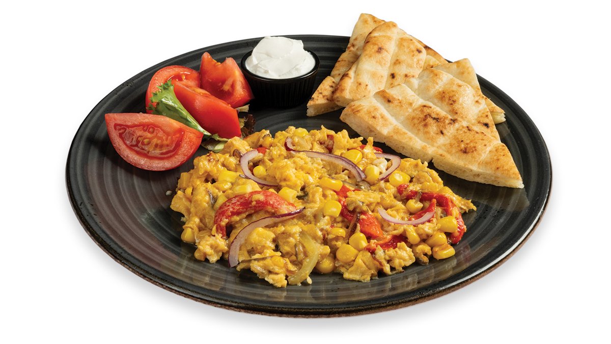 3 vmešana jajca, čebula, paprika, koruza, paradižnik, lepinja, kisla smetana V ceno jedi je vštet znesek 0.40 eur za biorazgradljivo embalažo
