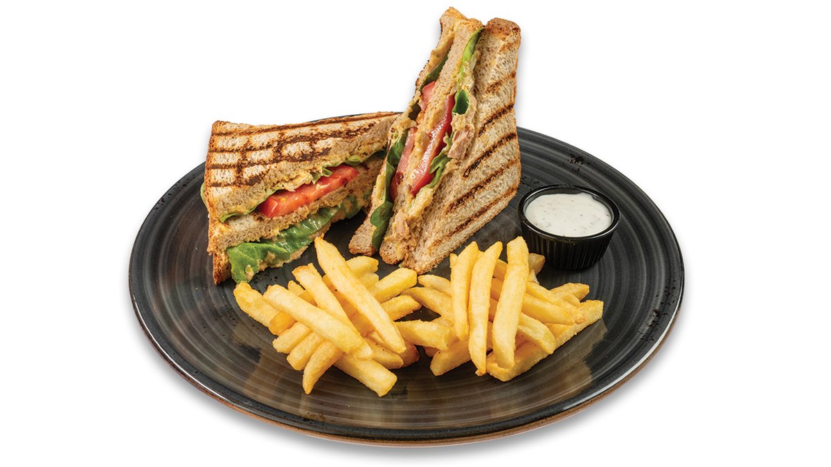 Opečenec 3 kosi, tunina 60 g, čebula, gorčica, majoneza, paradižnik, zelje, solata, pomfrit 100 g V ceno jedi je vštet znesek 0.40 eur za biorazgradljivo embalažo