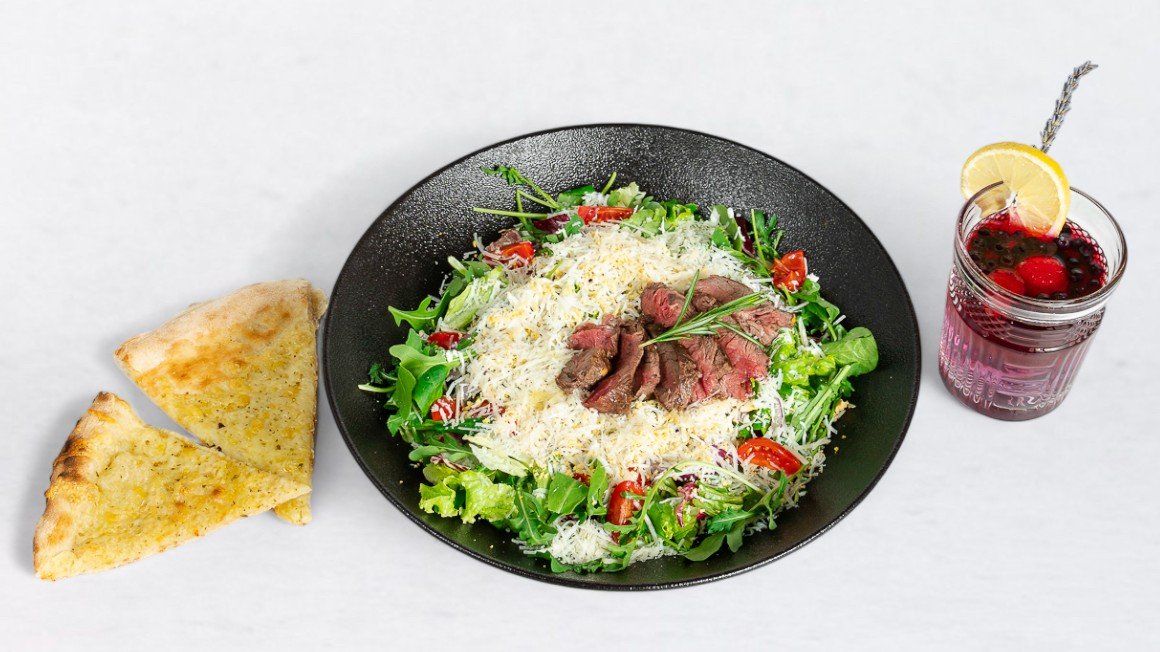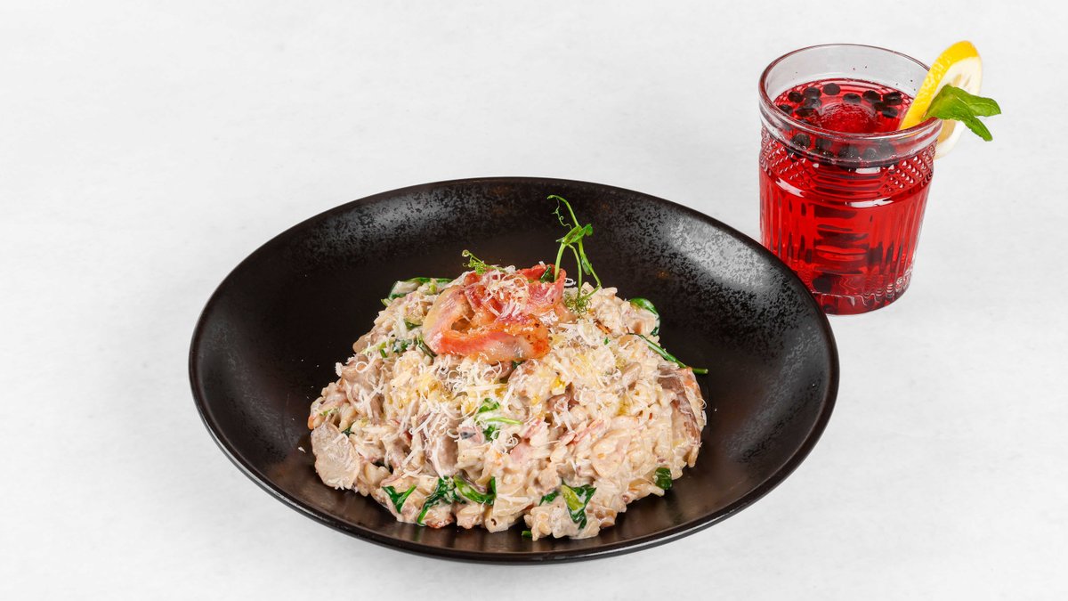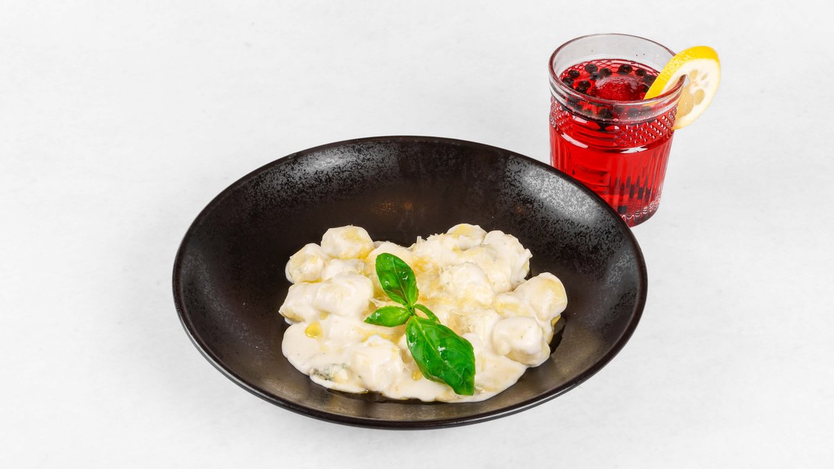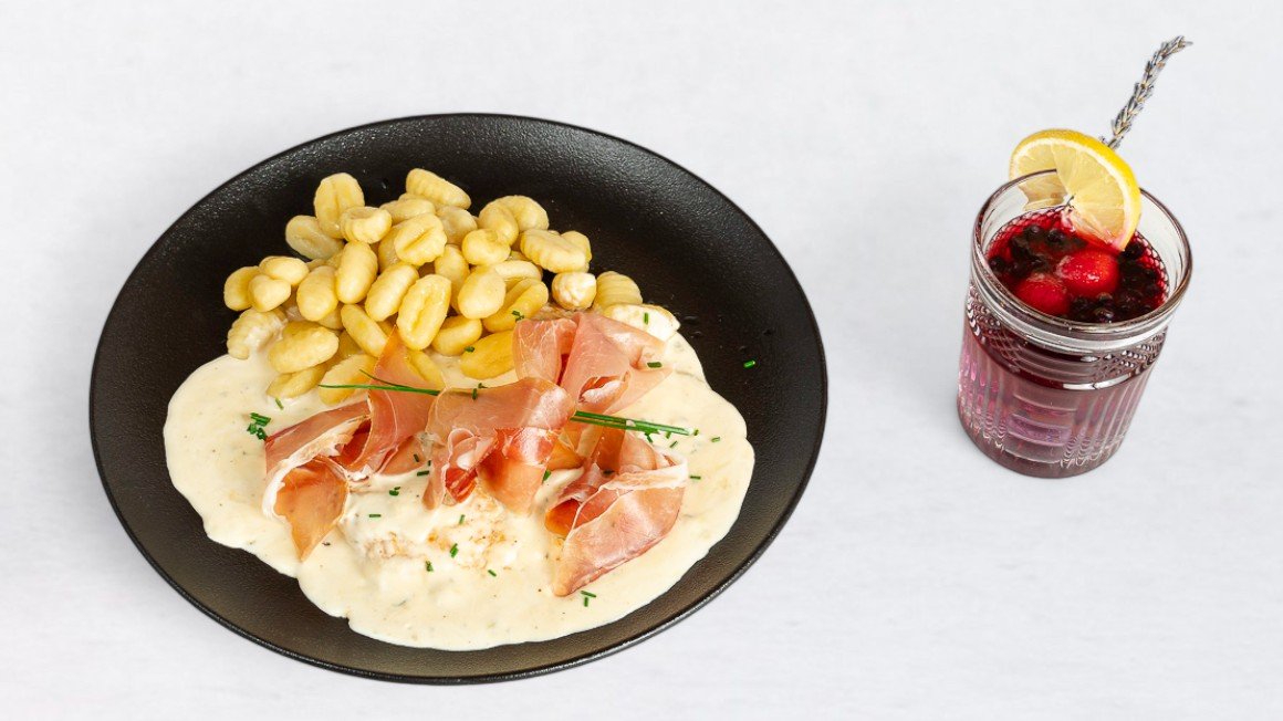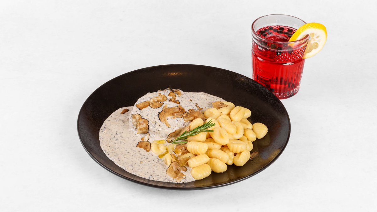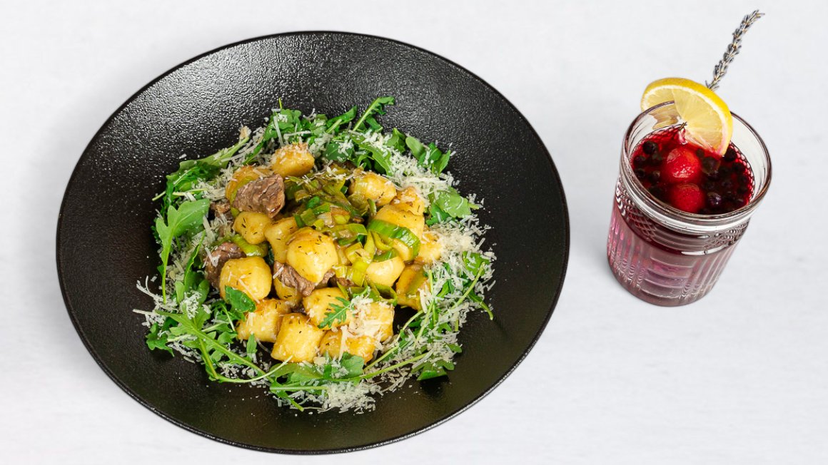 Njoki s pljučnim rezinami, porom, grana padano in rukolo in domači sok 0.33 l