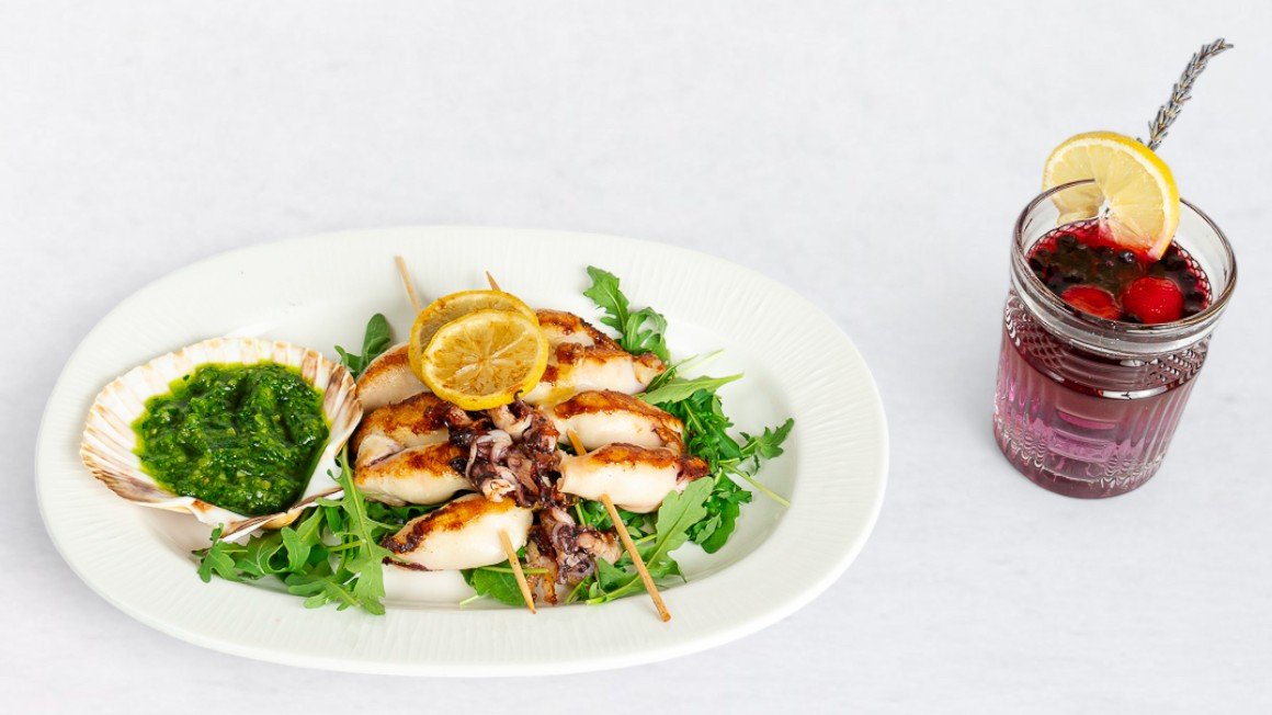 Polnjeni lignji na žaru s tržaško omako in domači sok 0.33 l