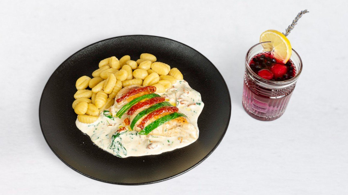 Piščančji zrezek v kremni omaki s pestom, paradižniki, špinačo, njoki, domači sok 0.33l V ceno jedi je všteto doplačilo 0.50 eur za biorazgradljivo embalažo