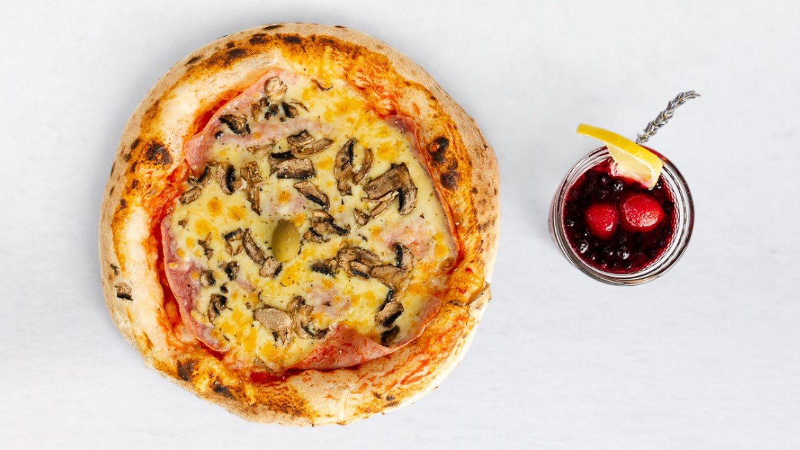 Pelati, sir, šunka, šampinjoni, oliva, origano V ceno jedi je všteto doplačilo 0.60 eur za biorazgradljivo embalažo
