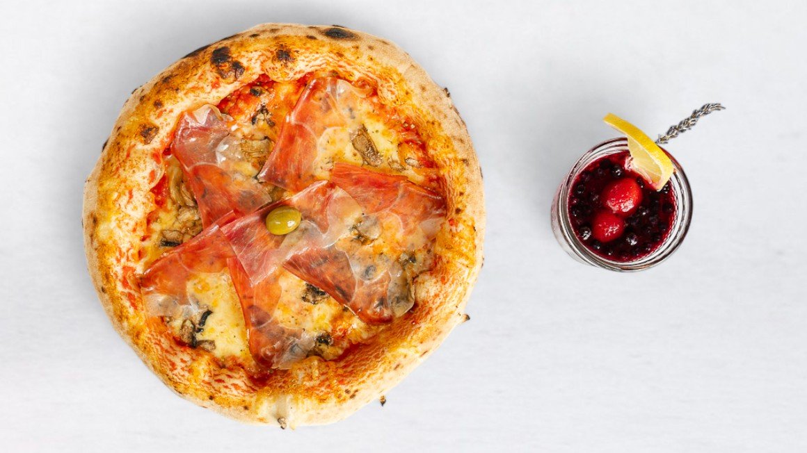 Pelati San Marzano DOP, mozzarella (pr´Matevž), kraški pršut, sveža bazilika, pinjole, istrski tartuf, olje tartufa (Lisjak), olive taggiasche V ceno jedi je všteto doplačilo 0.60 eur za biorazgradljivo embalažo