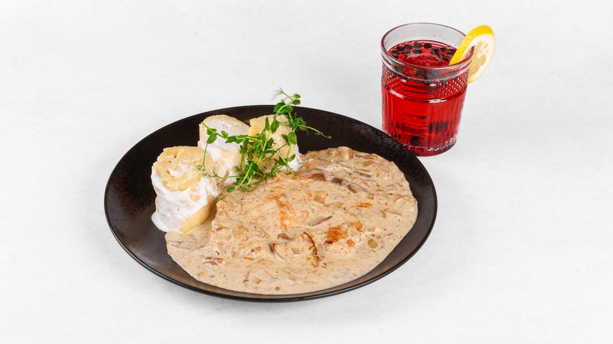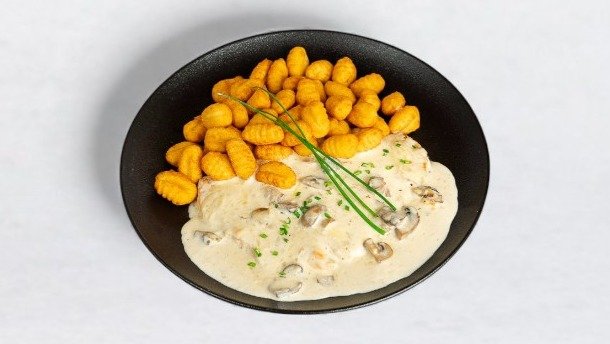 Piščančji zrezek v kremni omaki s pestom, paradižniki, njoki, domači sok 0.33l