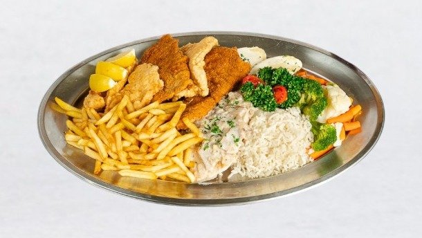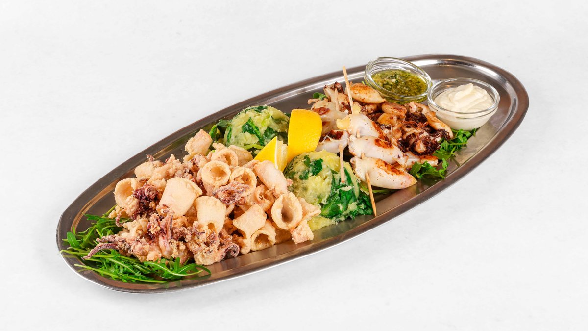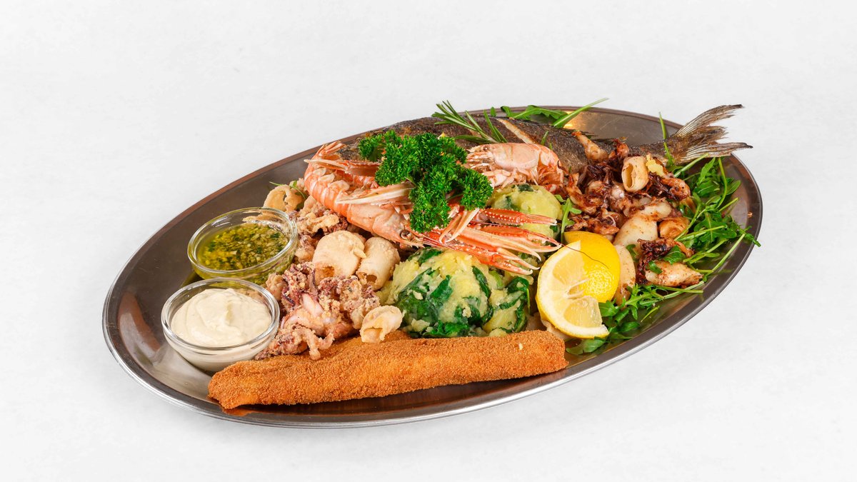 Sveža riba in lignji na žaru, ocvrti lignji, file osliča, škampi na žaru (4 kosi), blitva s krompirjem, tatarska in tržaška omaka V ceno jedi je všteto doplačilo 1 eur za biorazgradljivo embalažo