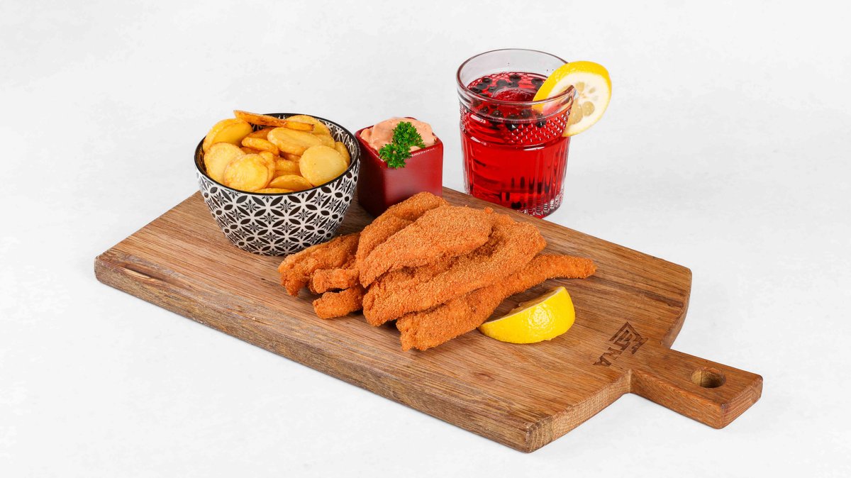 Ocvrti oslič po dunajsko s pomfrijem, tatarsko omako in domači sok 0.33