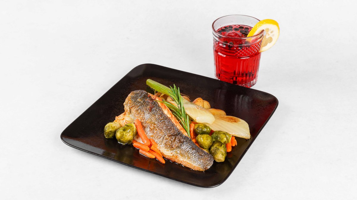 File svežega brancina s sezonsko zelenjavo, mlad krompir in domači sok 0.33 l