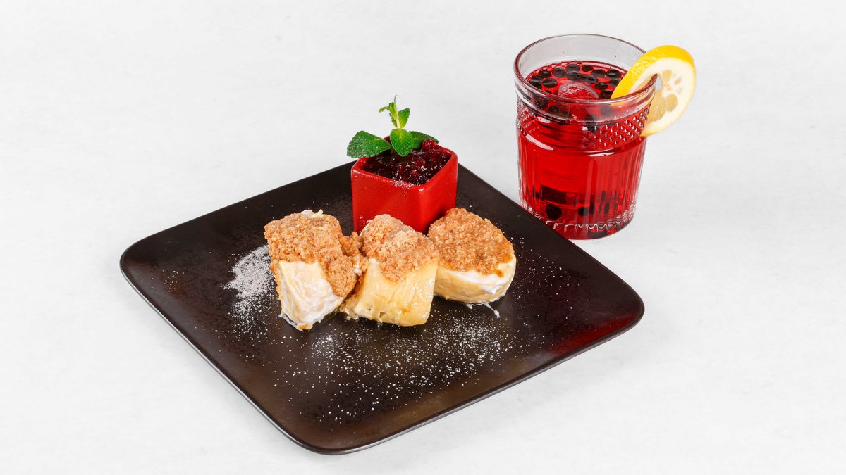 Domači štruklji z drobtinami in brusnično marmelado in domači sok 0.33 l