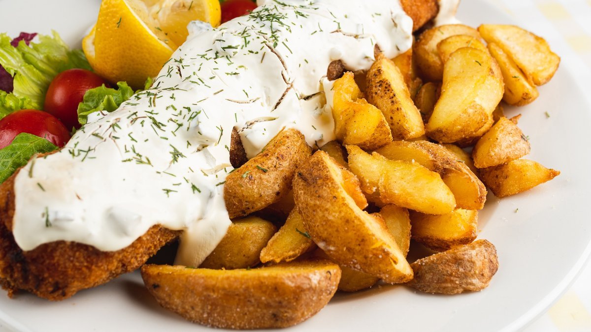 Ocvrt piščančiji zrezek, pomfri, tatarska omaka