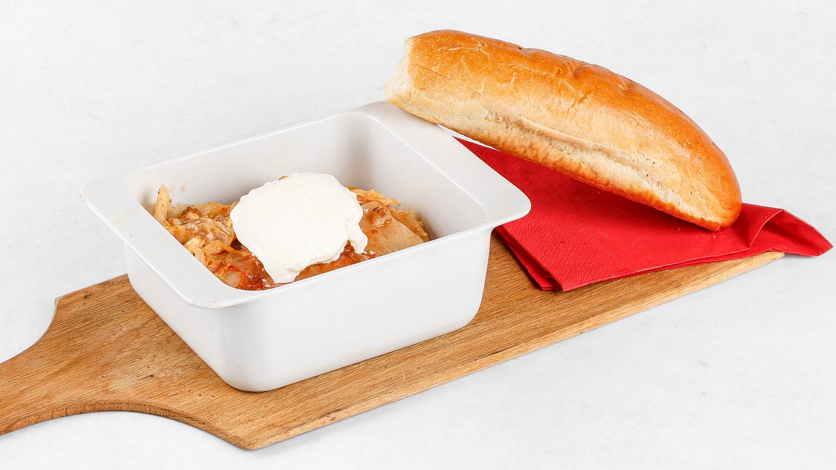 Zapečena sarma s kislo smetano in focaccio V ceno jedi je všteto doplačilo 0.50 eur za biorazgradljivo embalažo