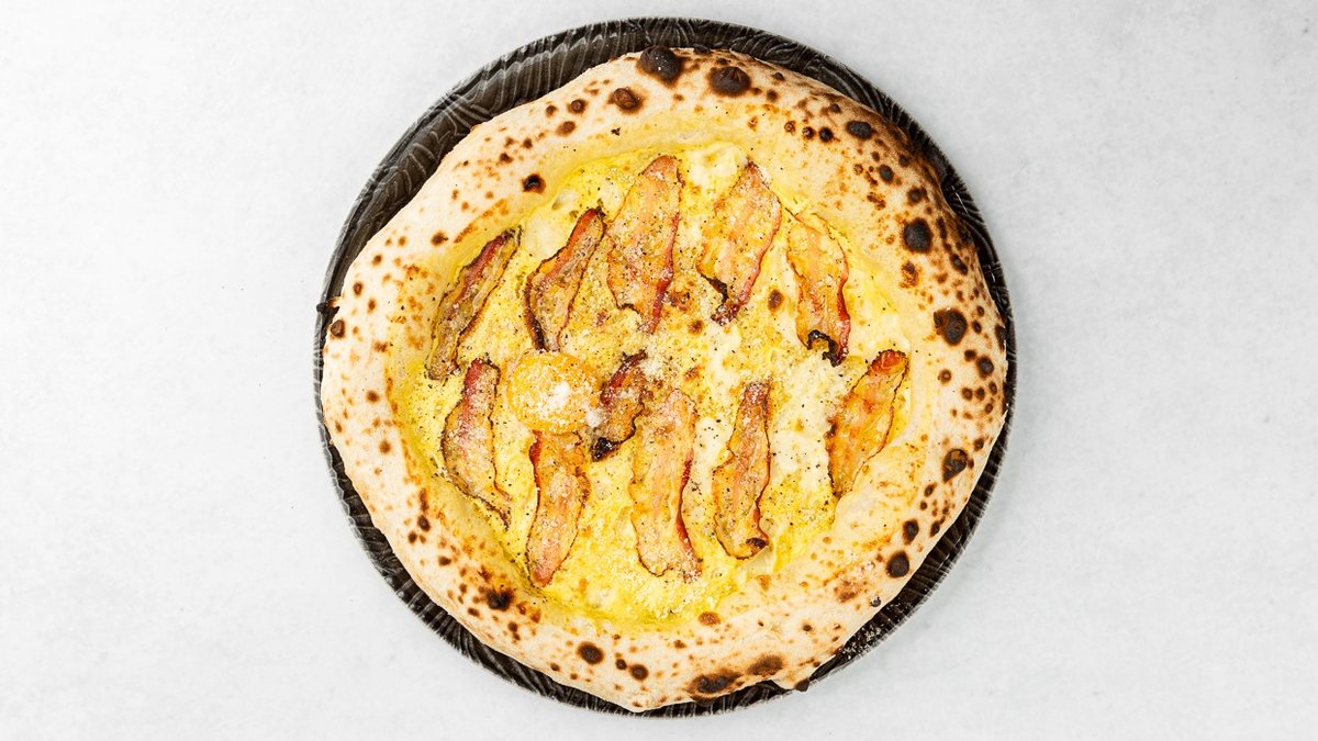 Krema jajčnega rumenjaka, mocarela Fior di latte, slanina Guanciale iz svinjskih ličnic, pekorino, poper, rumenjak V ceno jedi je všteto doplačilo 0.30 eur za biorazgradljivo embalažo