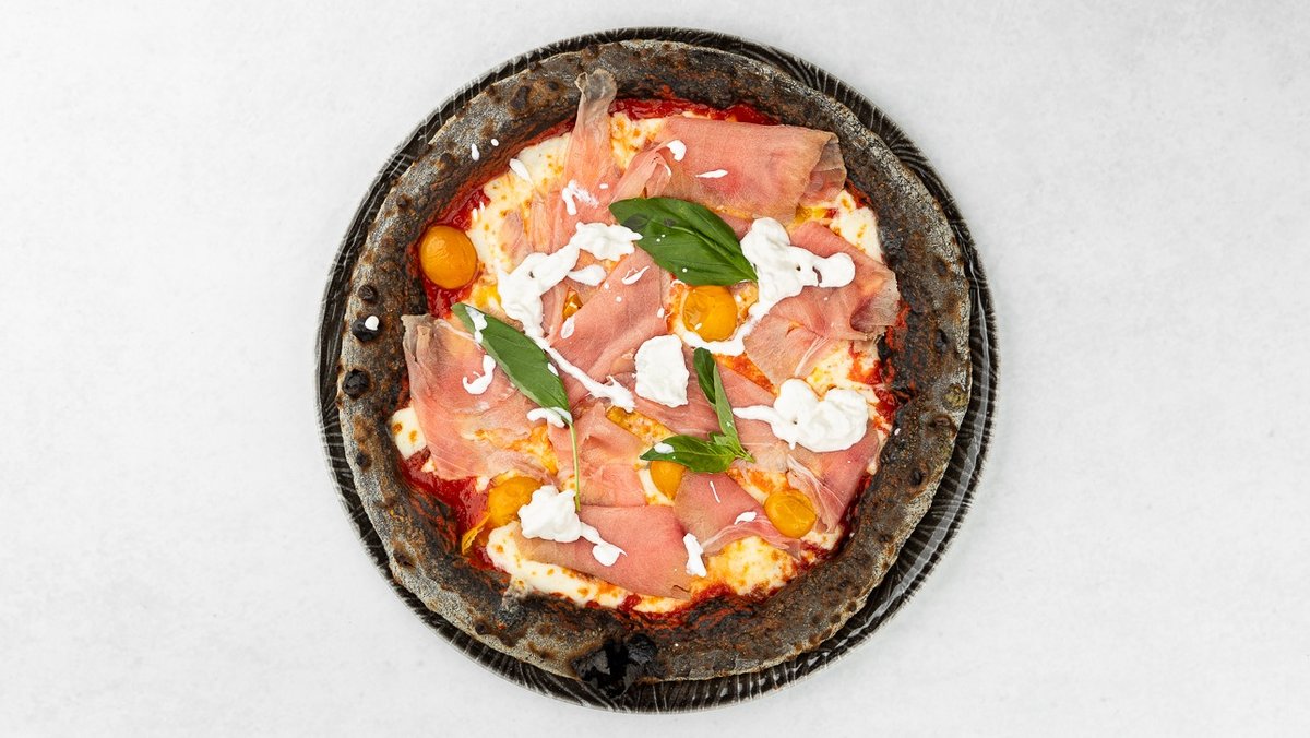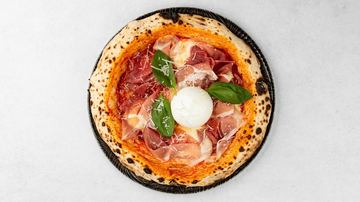 Pelati San Marzano D.O.P., mocarela Fior di latte, pršut San Daniele, burrata, sveža bazilika V ceno jedi je všteto doplačilo 0.30 eur za biorazgradljivo embalažo