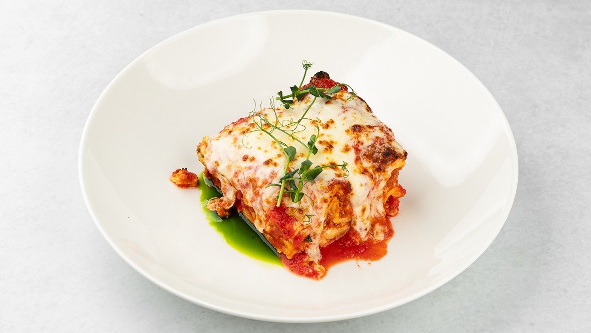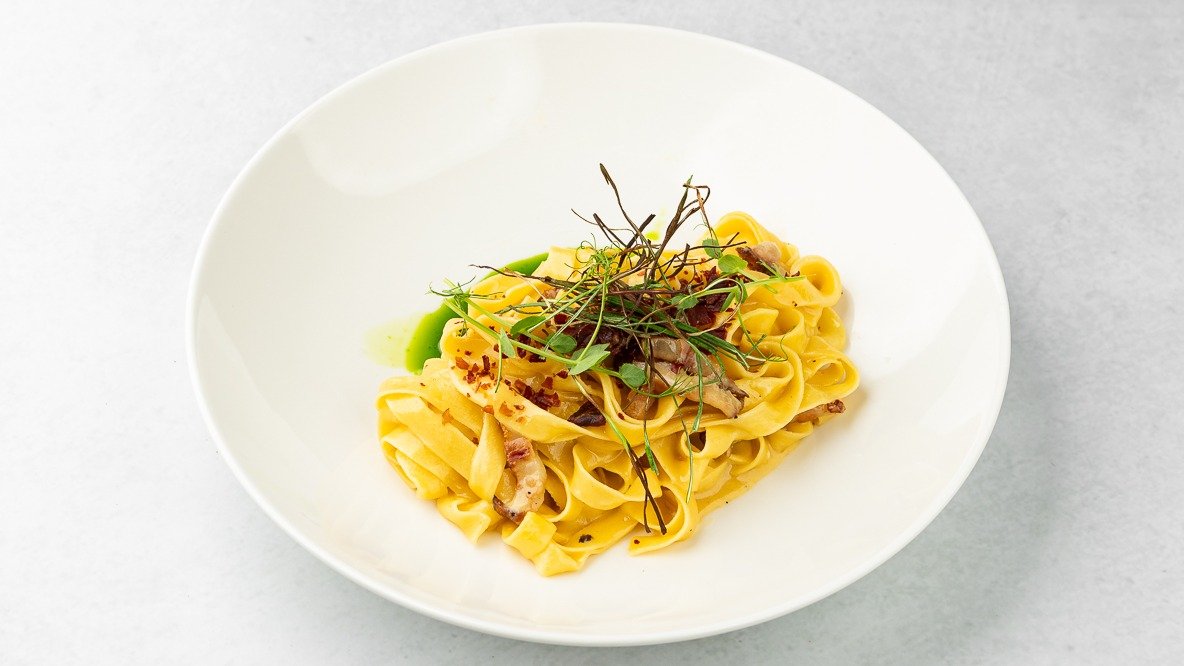 Sveže testenine, slanina Guanciale iz svinjskih ličnic, jajčni rumenjak, sir Pecorino, črni poper, Bresaola - goveji pršut, sir Grana Padano, espuma burrate, mikro zelenje V ceno jedi je všteto doplačilo 0.30 eur za biorazgradljivo embalažo
