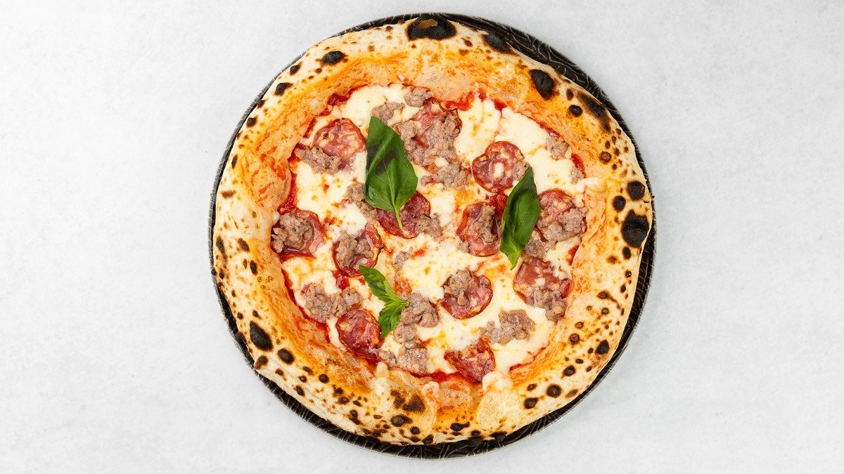 Pelati San Marzano D.O.P., mocarela Fior di latte, salsiccia, suha salama, parmezan, sveža bazilika V ceno jedi je všteto doplačilo 0.30 eur za biorazgradljivo embalažo