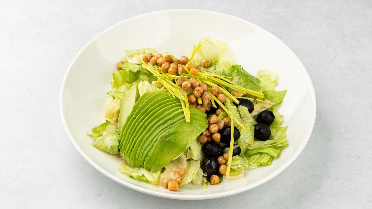 Solata ledenka, popečena čičerika, avokado, črne olive, česnovi krutoni, por, sir Grana padano, parmezanov preliv V ceno jedi je všteto doplačilo 0.30 eur za biorazgradljivo embalažo