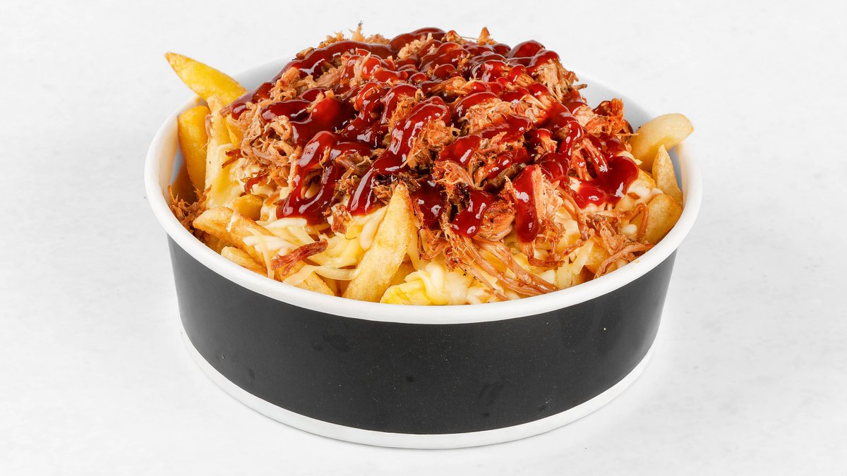 Pomfri, mix sirov, trgana svinjina, BBQ omaka