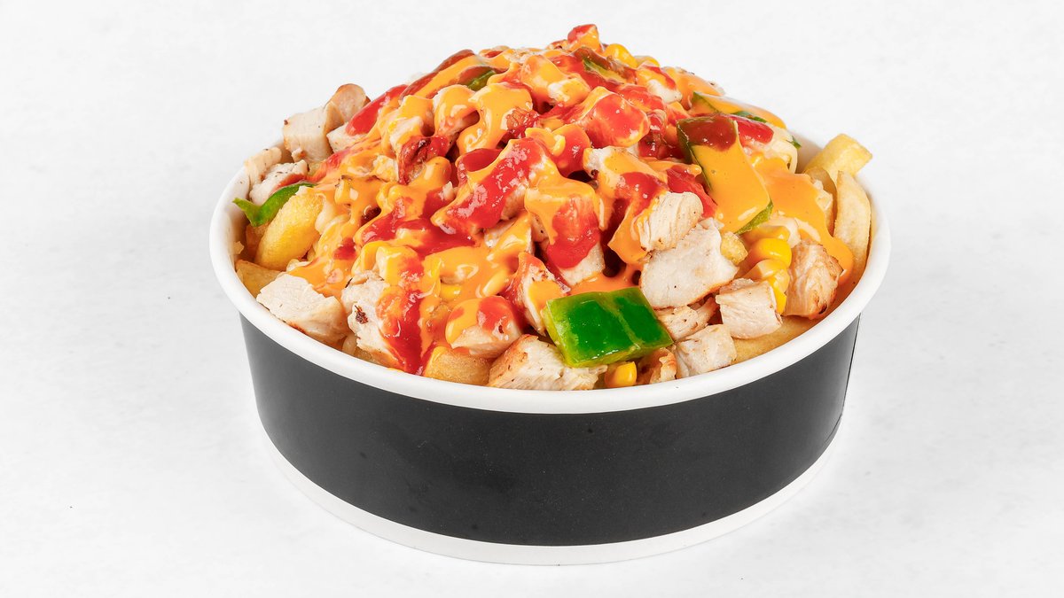 Pomfri, mix sirov, piščančje kocke, koruza, nacho omaka, rdeča salsa
