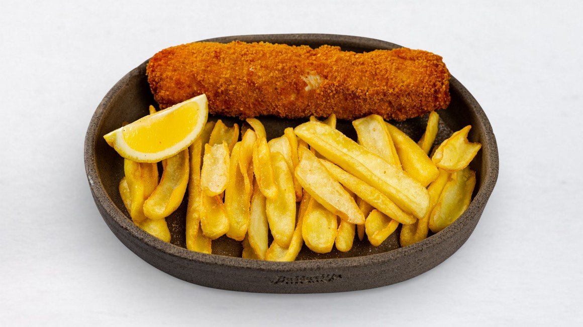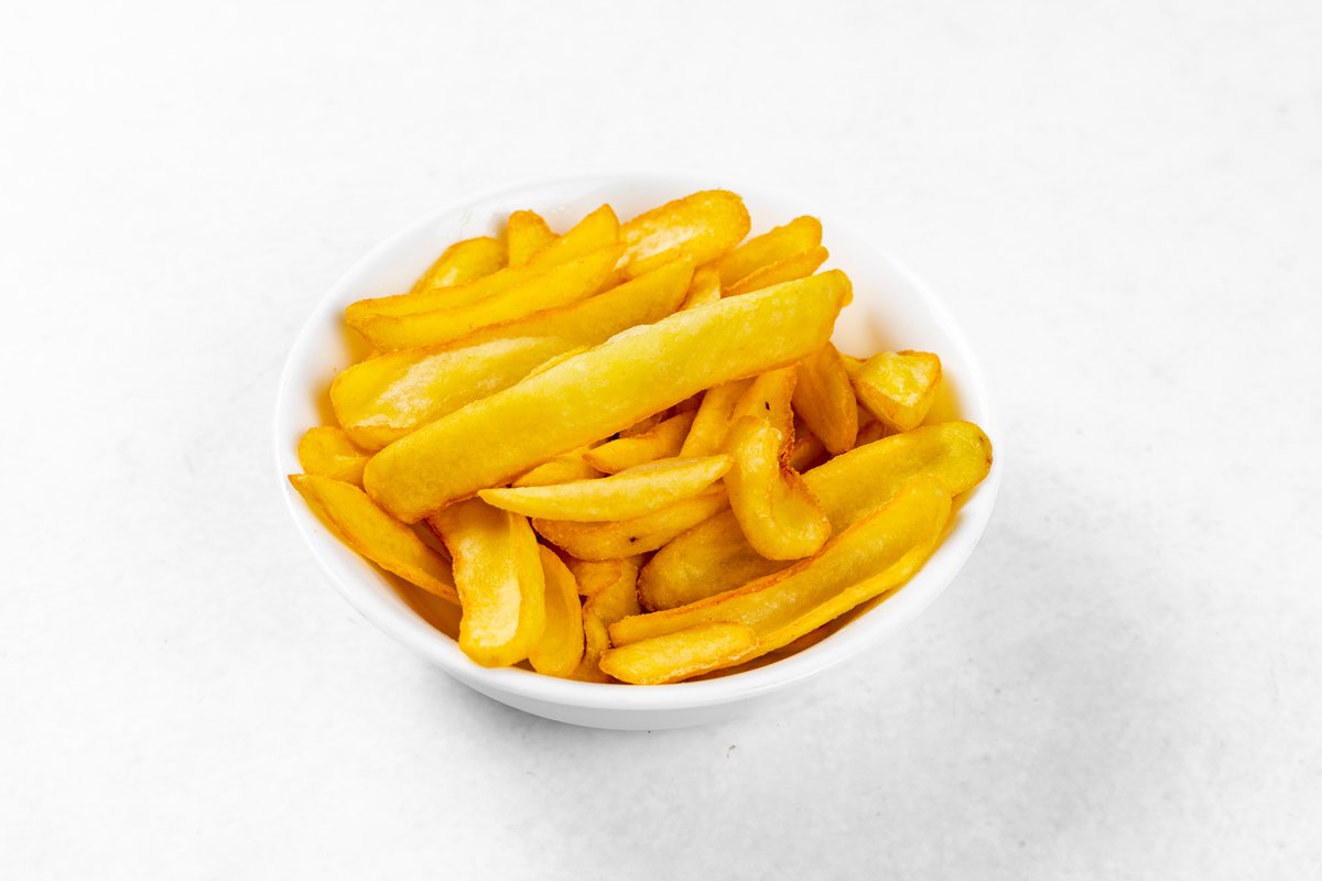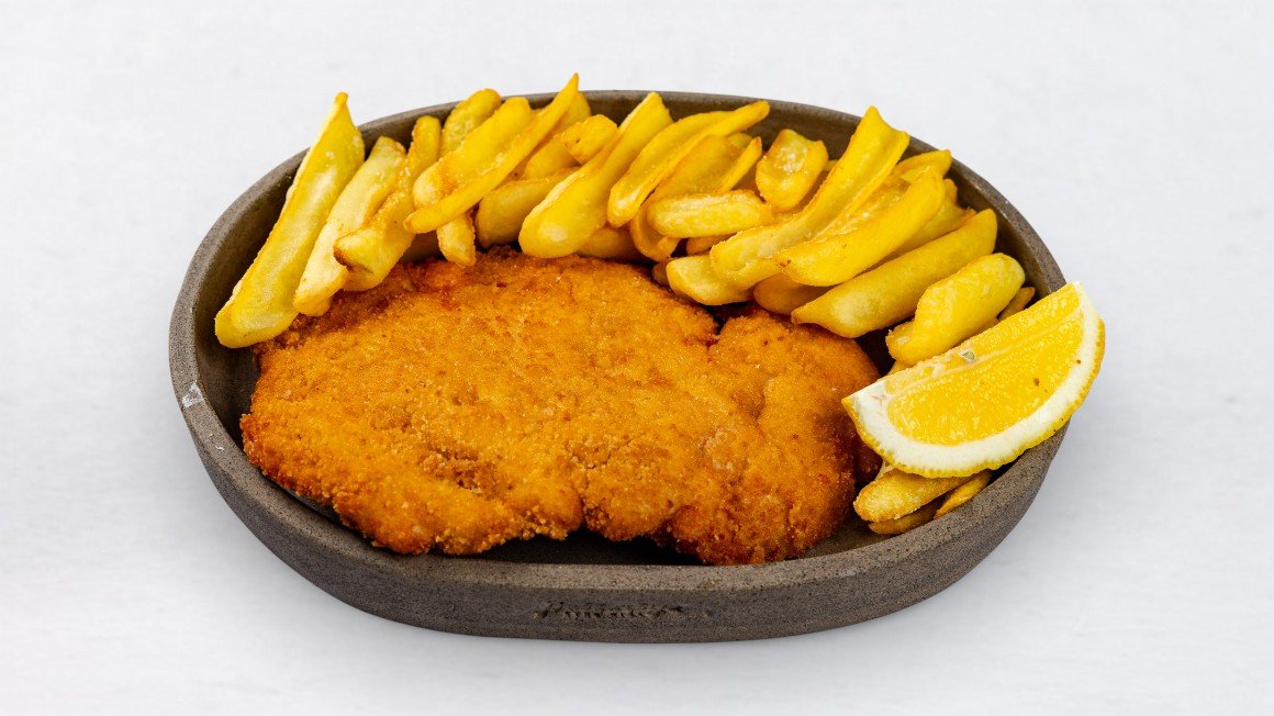 Ocvrt piščančji zrezek, ocvrt krompir V ceno jedi je všteto doplačilo 0.50 eur za biorazgradljivo embalažo