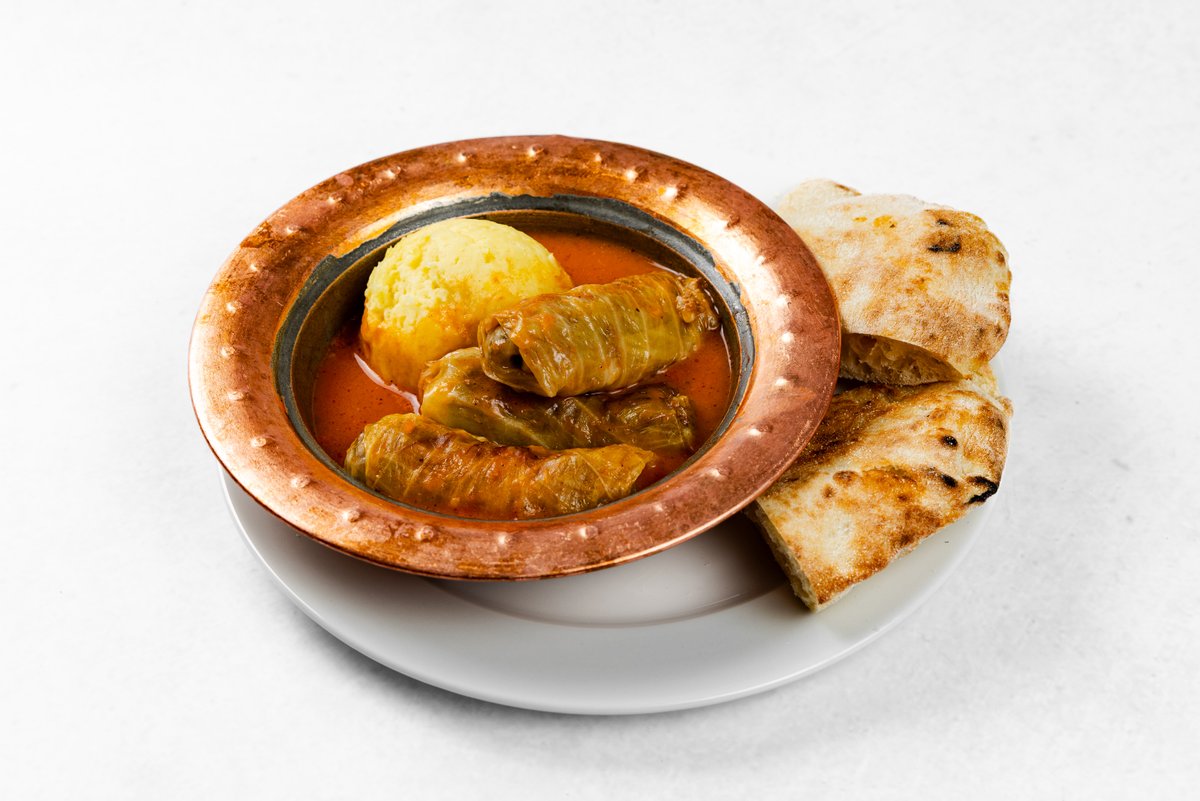 V zelje zavito mleto goveje meso, paradižnikova omaka, pire krompir in lepinja