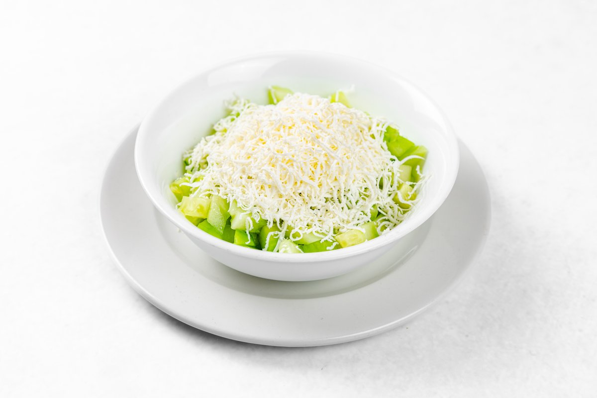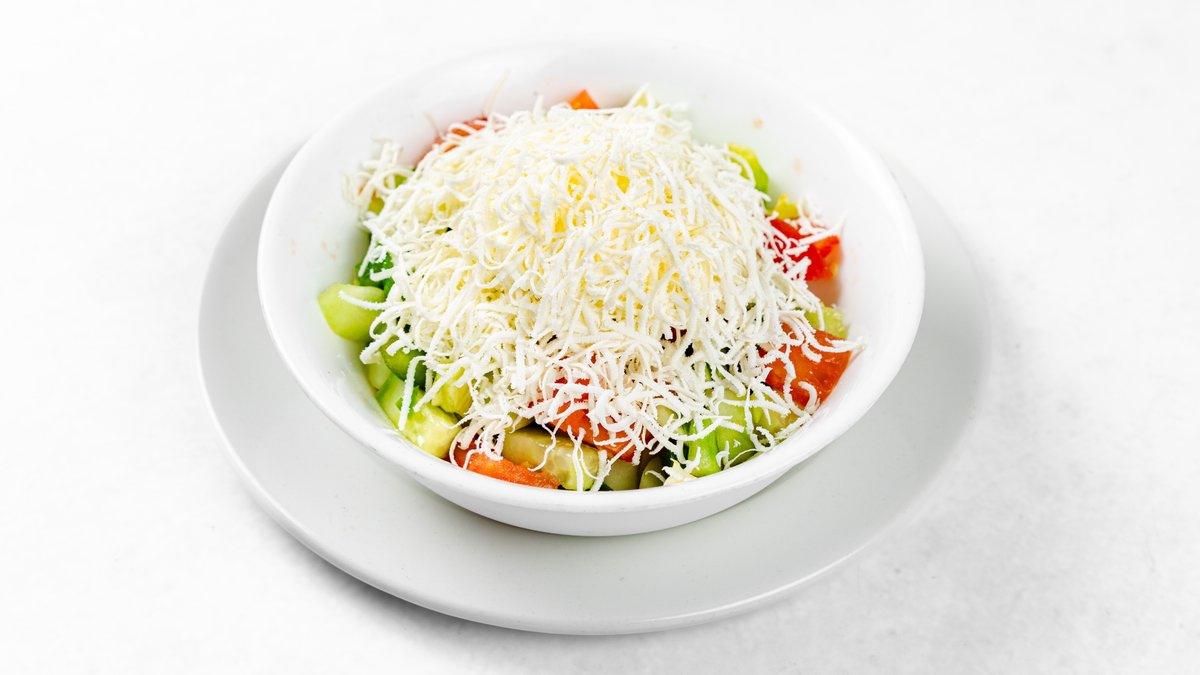 Piščančji zrezek (220 g), šopska solata, 1/2 lepinje V ceno jedi je všteto doplačilo 0.50 eur za biorazgradljivo embalažo