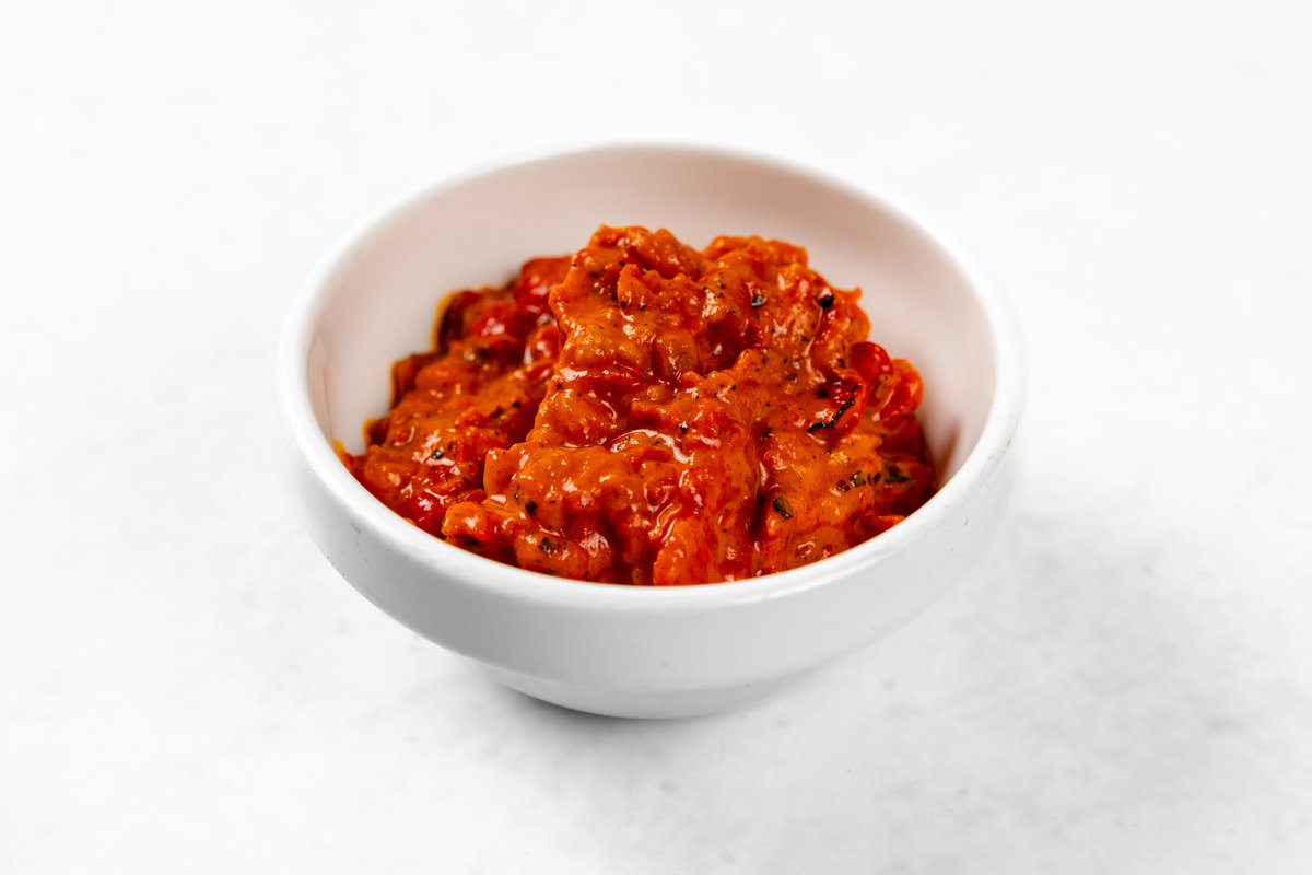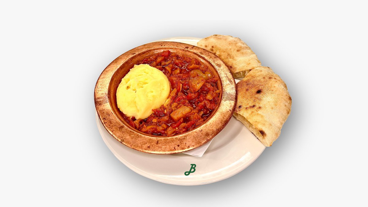 Na čebuli dušena paprika in paradižnik, obogateno s pečeno malancano, pire krompir, 1/2 lepinje