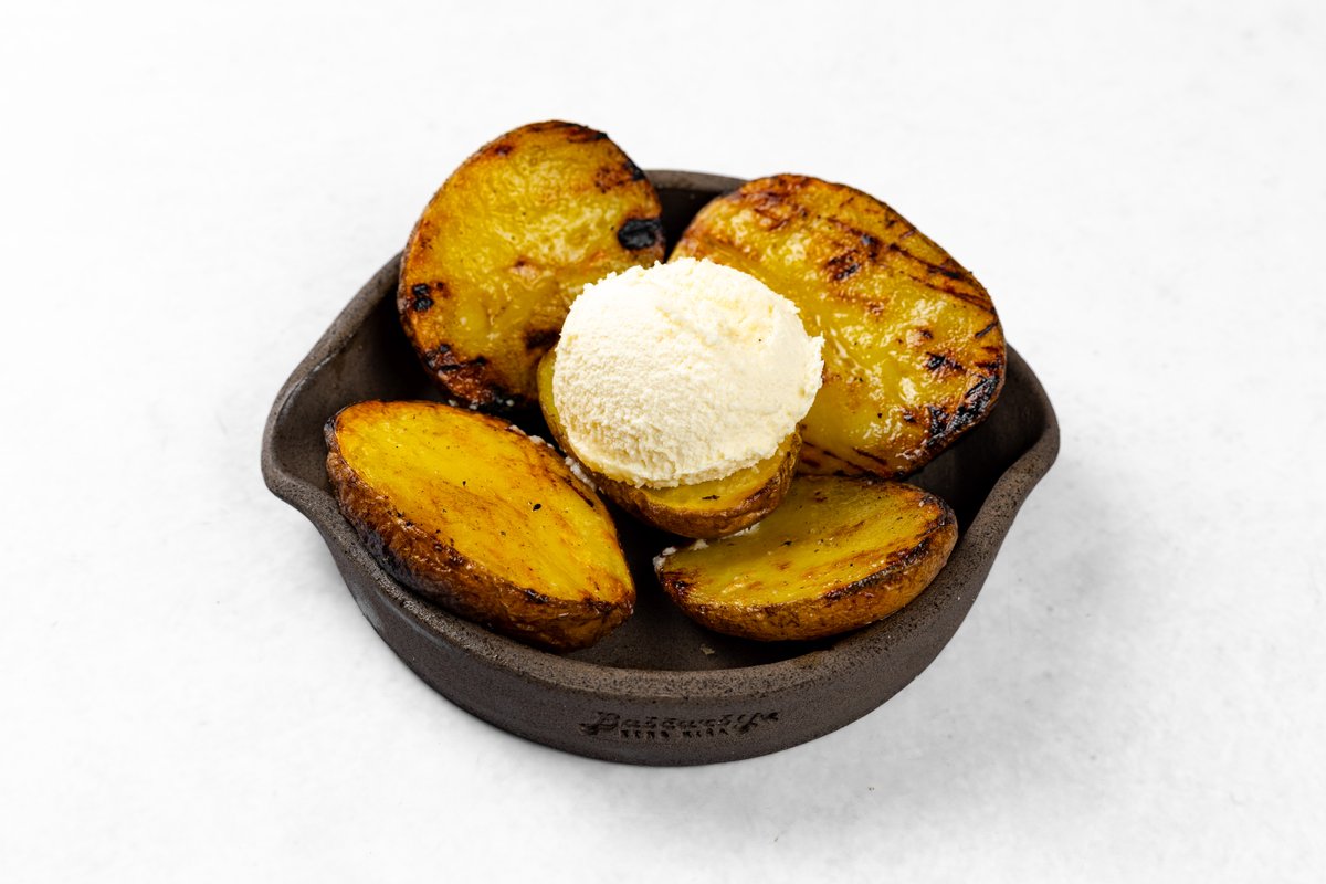 Piščančji trakci z žara, postreženi na stopljenem kajmaku, pečen krompir, pol lepinje