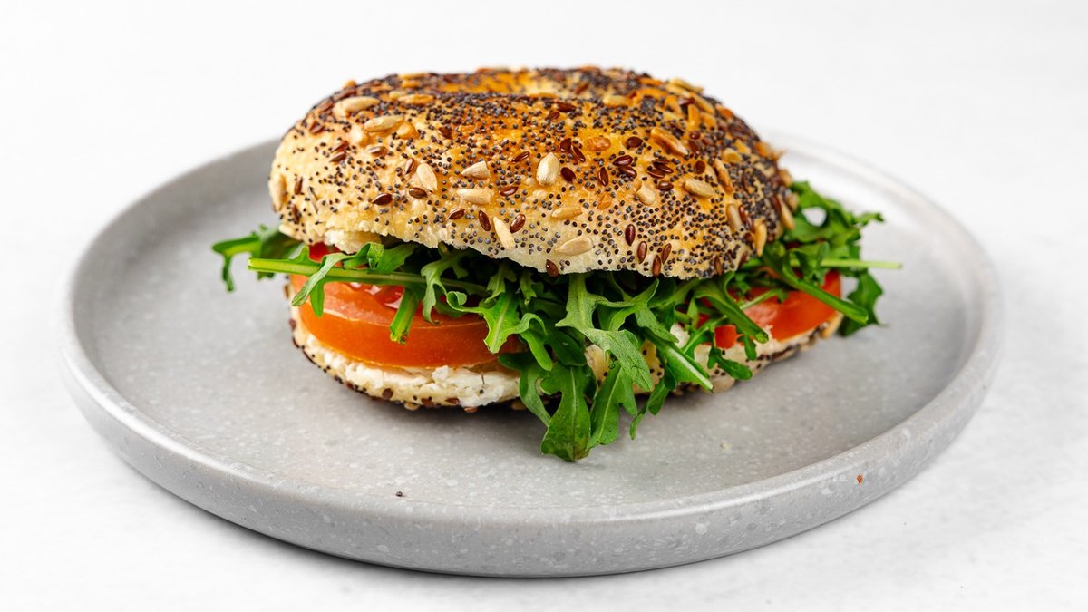 [100% drožast bagel, kremni sir, sveži paradižnik in rukola.]
