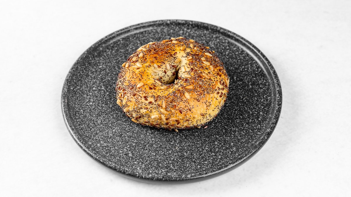 [100% drožast bagel iz bogatega brioš testa, posut s semeni (sončnična semena, lan in mak). Fermentiran 24h, brez aditivov in kvasa.]