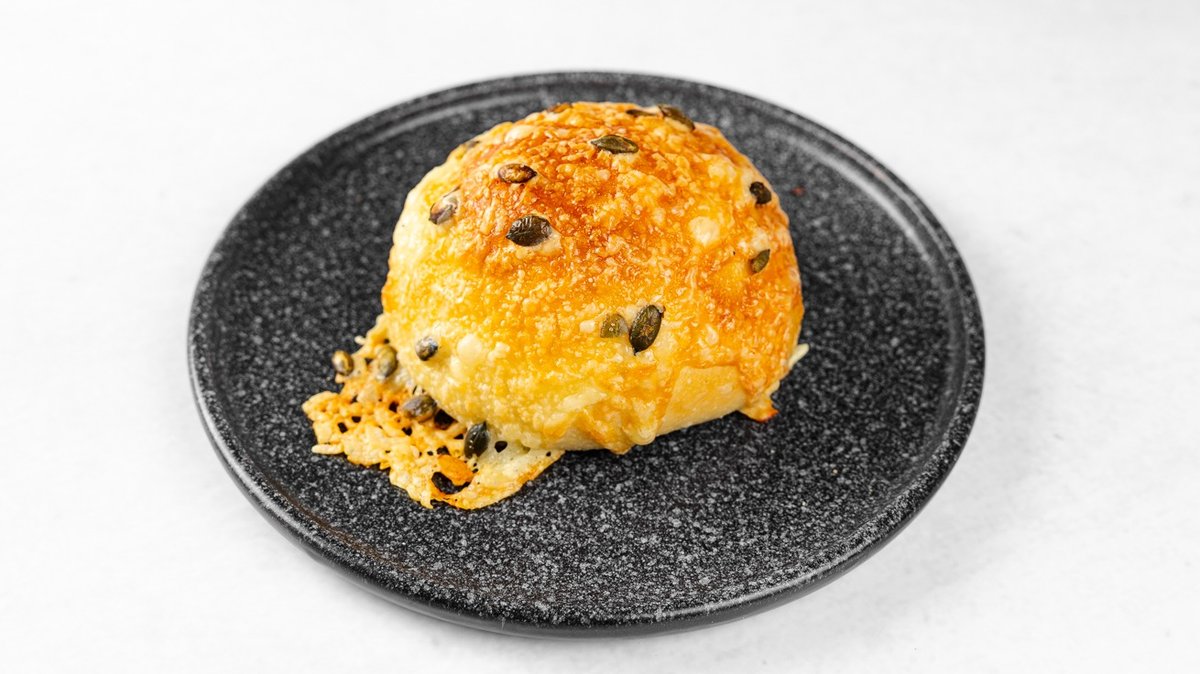 [100% drožasta štručka iz bogatega brioš testa, posuta z bučnimi semeni in sirom]