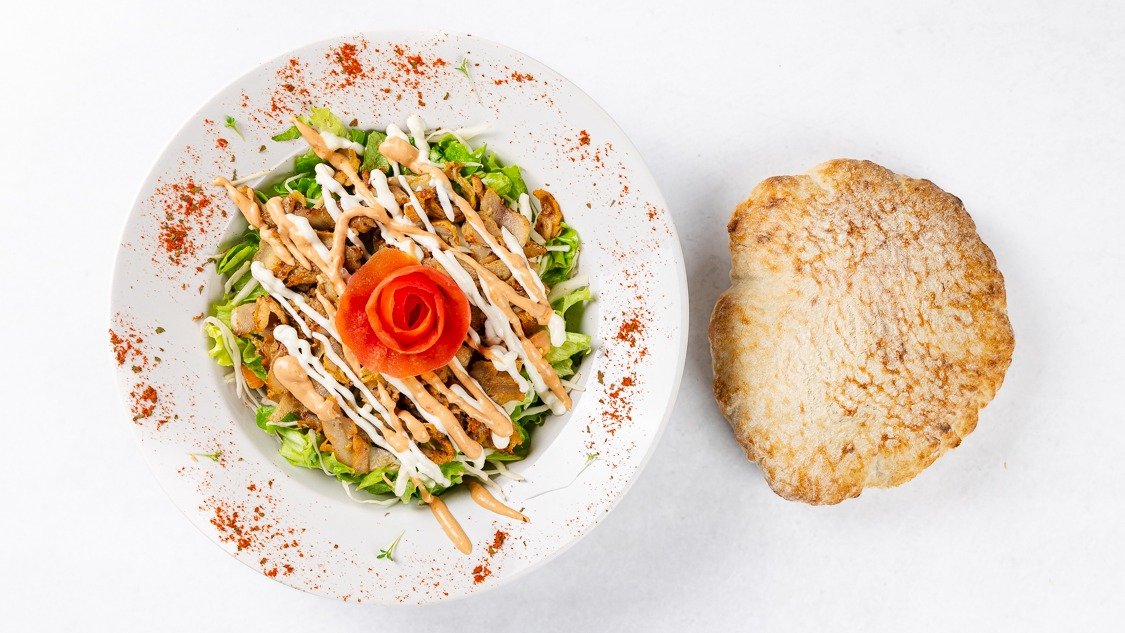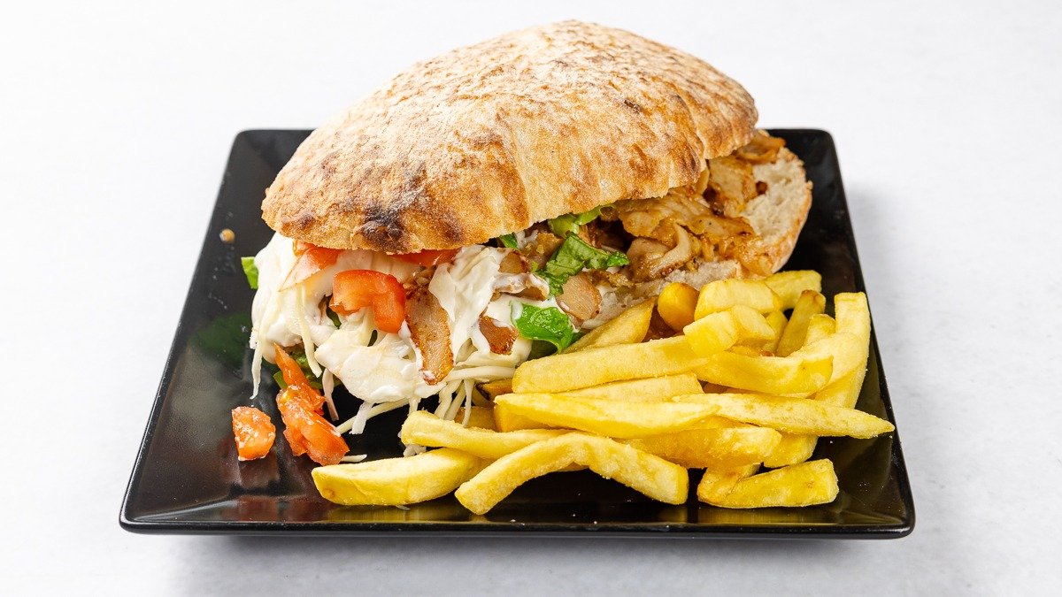 Lepinja, omake, piščančje kebab meso, solata, paradižnik, zelje, čebula in krompirček