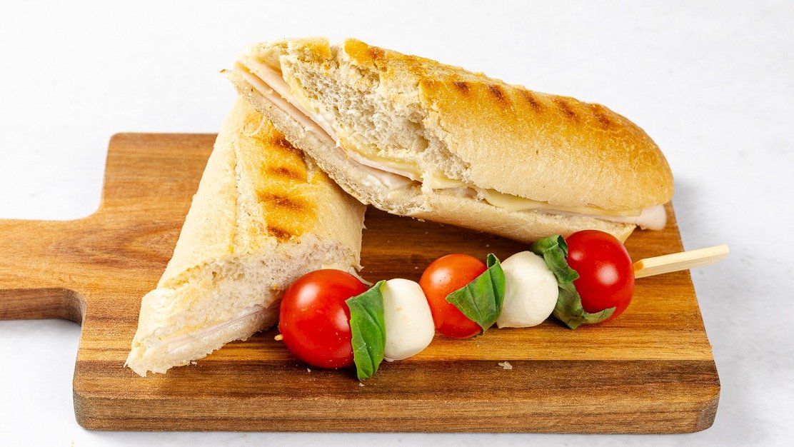 Hrustljavo pečen domač sendvič iz bagete, majoneze, piščančje posebne salame in sira ter posebej dodan češnjev paradižnik z mozzarello