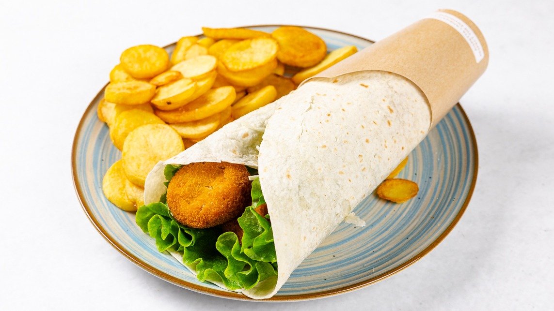Tortilja, ketchup, majoneza, solata, paradižnik, paprika, zelje, piščančji medaljoni, sir, vse skupaj zapečeno, in dollar krompirček